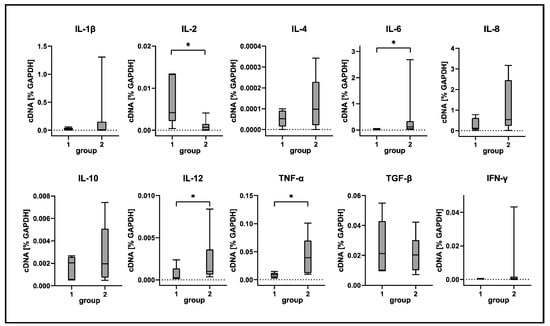 Cytokine expression analyses of canine distemper virus (CDV)-infected lung tissue. IL = interleukin; TNF-α = tumor necrosis factor alpha; TGF-β = transforming growth factor beta; IFN-γ = interferon gamma. Groups: 1 = non-infected control lungs; 2 = acute CDV infection; box and whisker plots display median and quartiles with maximum and minimum values. Significant differences (p ≤ 0.05, Kruskal–Wallis H test) are labeled by asterisks.