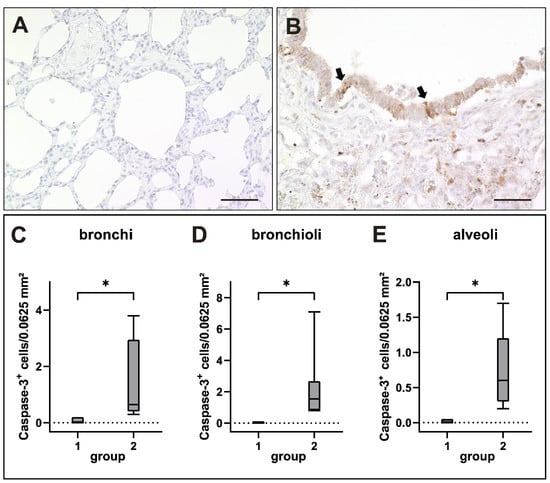 Apoptosis in canine distemper virus (CDV)-infected lungs. (A) Non-infected control lung. (B) Lung of a dog with CDV infection with CC-3+ apoptotic cells within the bronchiolar epithelium (arrows). (C–E) Increased numbers of apoptotic cells in bronchi (C), bronchioli (D) and alveoli (E) of infected dogs. Groups: 1 = non-infected control lung; 2 = acute CDV infection; box and whisker plots display median and quartiles with maximum and minimum values. Significant differences (p ≤ 0.05, Kruskal–Wallis H test) are labeled by asterisks. Scale bars: (A,B): 50 µm.