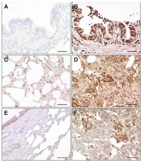 Expression of interferon-related genes in canine distemper virus (CDV)-infected lungs. (A,B) Mx protein in a non-infected (A) and acutely CDV-infected lung (B). (C,D) Protein kinase R (PKR) antigen detection in a non-infected (C) and acutely CDV-infected lung (D). (E,F) Interferon-simulated gene 15 (ISG15) antigen detection in basal bronchial epithelium of a non-infected lung (E) and in an acutely CDV-infected lung (F). Scale bars: 50 µm.