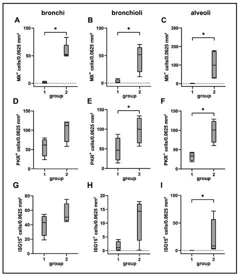 Quantification of Mx (A–C), PKR (D–F) and ISG15 (G–I) in lung tissue of canine distemper virus (CDV)-infected dogs. Groups: 1 = non-infected control lungs; 2 = acute CDV infection; box and whisker plots display median and quartiles with maximum and minimum values. Significant differences (p ≤ 0.05, Kruskal–Wallis H test) are labelled by asterisks.