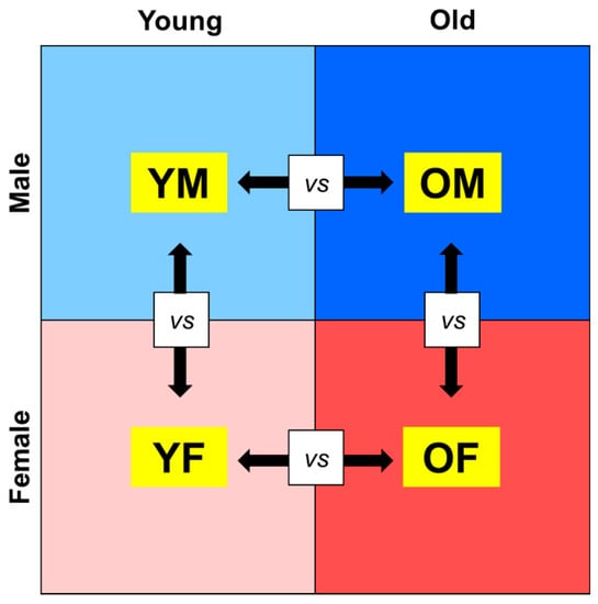 Study designs for transcriptomic analysis of age and sex differences. RNA-Seq data of rat liver tissues were categorized into four groups, and DEGs were calculated by two groups. OM, old male; YM, young male; OF, old female; YF, young female.