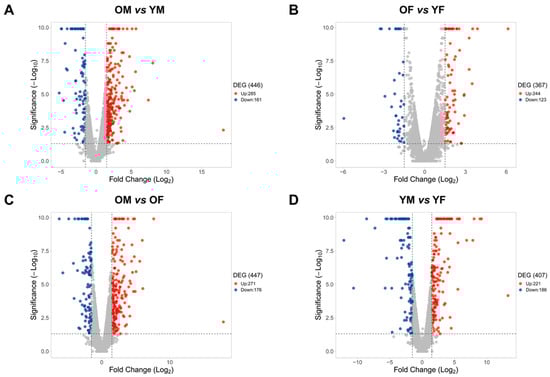Age- and sex-differentially expressed genes from RNA-Seq data of (A) OM vs. YM, (B) OF vs. YF, (C) OM vs. OF, and (D) YM vs. YF from SD rats (n = 3 in each group). Red dots represent upregulated genes between two groups. Blue dots represent downregulated genes between two groups. Grey dots represent genes that showed no change between two groups. The criteria for a DEG are |FC| > 1.5 and p-value < 0.05. OM, old male; YM, young male; OF, old female; YF, young female.