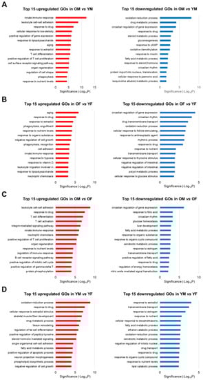 Top 15 Gene Ontology (GO) enrichment analysis of RNA-Seq data of (A) OM vs. YM, (B) OF vs. YF, (C) OM vs. OF, and (D) YM vs. YF from SD rats (each n = 3). Upregulated GOs of immune response and downregulated GOs of metabolism and circadian rhythm were detected during aging in both sexes. OM, old male; YM, young male; OF, old female; YF, young female.