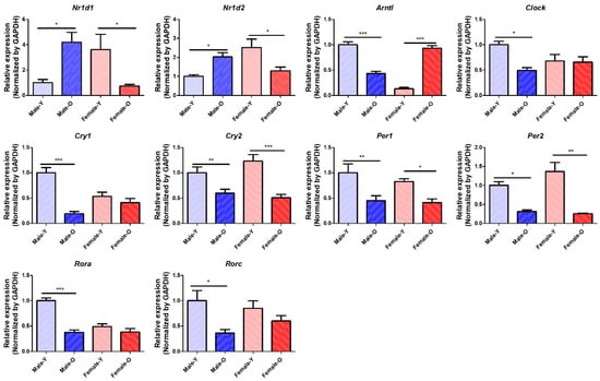 Relative mRNA expression of circadian genes differentially expressed across sex and age in SD rats (n = 6 per group). Nr1d1, Nr1d2, Arntl, Clock, Cry1, Cry2, Per1, Per2, Rora, and Rorc showed sex differences in their gene expression during liver aging. Nr1d1, nuclear receptor subfamily 1 group D member 1; Nr1d2, nuclear receptor subfamily 1 group D member 2; Arntl, aryl hydrocarbon receptor nuclear translocator like; Clock, clock circadian regulator; Cry1, cryptochrome circadian regulator 1; Cry2, cryptochrome circadian regulator 2; Per1, period circadian regulator 1; Per2, period circadian regulator 1; Rora, RAR-related orphan receptor A; Rorc, RAR-related orphan receptor C; Y, young; O, old; * p < 0.05, ** p < 0.01, and *** p < 0.001 between the two groups.