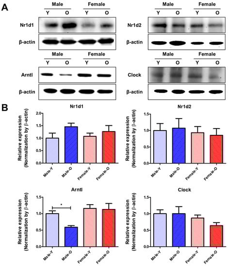 Protein expressions of Nr1d1/2, Arntl, and Clock which were differentially expressed according to sex and age in SD rats (n = 4 or 6 per group). (A) Representative band images of Nr1d1/2, Arntl, and Clock. (B) Relative expression of Nr1d1/2, Arntl, and Clock. These proteins showed sex differences in their expression during liver aging. Nr1d1, nuclear receptor subfamily 1 group D member 1; Nr1d2, nuclear receptor subfamily 1 group D member 2; Arntl, aryl hydrocarbon receptor nuclear translocator like; Clock, clock circadian regulator; Y, young; O, old. * p < 0.05 between the two groups.