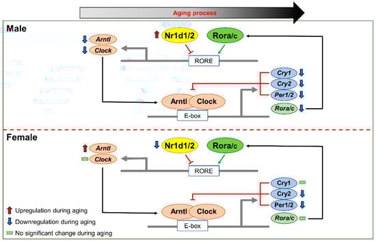 The regulation of circadian rhythms has been demonstrated. In mammals, aryl hydrocarbon receptor nuclear translocators, such as (Arntl or Bmal1) and the clock circadian regulator (Clock), organize heterodimers to promote the expression of cryptochrome circadian regulators (Cry), period circadian regulators (Per), and other circadian genes [,]. Cry and Per also organize heterodimers and repress the Arntl–Clock complex, which serves as a negative feedback loop in circadian rhythms [,]. In addition, nuclear receptor subfamily 1 group D member 1 (Nr1d1), nuclear receptor subfamily 1 group D member 2 (Nr1d2), RAR-related orphan receptor A (Rora), and RAR-related orphan receptor C (Rorc) are transcription factors that bind retinoic acid-related orphan receptor binding elements (ROREs); however, Nr1d1 and Nr1d2 serve as repressors of ROREs and inhibit the expression of Arntl and Clock, thereby establishing another negative feedback loop in the circadian rhythm. Rora and Rorc form a positive feedback loop to induce the expression of Arntl and Clock [,,]. These studies have demonstrated that circadian genes such as Nr1d1/2, Arntl, Clock, Cry 1/2, Per1/2, and Rora/c construct regulatory systems with several feedback loops; however, how age and sex can change these circadian modulation systems remains unclear.