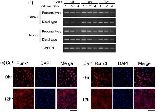 First, we examined whether Runx1 and/or Runx3 were expressed in keratinocytes. We used primary cultures of mouse keratinocytes. The cells cultured in a low-calcium environment mimicked immature proliferating keratinocytes, while those cultured under high-calcium conditions mimicked differentiating keratinocytes [21]. The levels of Runx transcripts were evaluated by semi-quantitative reverse transcription (RT)-PCR analysis. As Runx1 and Runx3 are transcribed from two different promoters, transcripts of proximal type and those of distal type were measured separately (Figure 1a). The keratinocytes were first cultured in low-calcium medium and then induced to differentiate by culturing in high-calcium medium for 0, 6, and 12 h. Both proximal and distal transcripts were detected for Runx1 and Runx3 before and after the induction of differentiation.