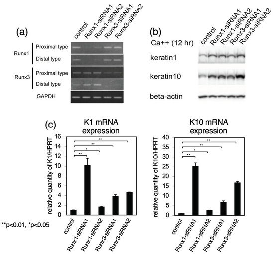 Effects of inhibition of Runx1/Runx3 expression on keratin 1/keratin 10 mRNA and protein expression in cultured keratinocytes. The cells were transfected with specific siRNA for Runx1 or Runx3, incubated for 4 h, induced to differentiate by raising the calcium concentration for 12 h, and harvested. Two different sequences were used for Runx1 and Runx3 siRNA, shown as siRNA1 and siRNA2. (a) Effects of Runx1/Runx3 siRNAs on Runx1/Runx3 expression. RNA was prepared from the cells and processed for RT-PCR. Proximal and distal Runx1/Runx3 transcripts were examined with GAPDH transcript as a control. (b) Effects of Runx1/Runx3 siRNAs on keratin 1 and keratin 10 protein expression. Protein lysates were prepared from the cells and processed for immunoblotting analysis of keratin 1, keratin 10, and β-actin (control). (c) Effects of Runx1/Runx3 siRNAs on keratin 1 and keratin 10 gene expression. RNA was prepared from the cells and processed for real-time RT-PCR analysis. The levels of keratin 1 and keratin 10 transcripts normalized relative to HPRT transcript are shown. In each experimental set out as above, we performed three independent trials and could obtain essentially similar results. In (a,b), representative results are shown, whereas in (c), mean ± standard deviation are shown, and statistically significant differences, if detected, are indicated by brackets (a student t-test; * p < 0.05, ** p < 0.01).