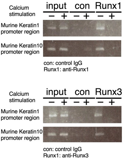 2.4. Endogenous Runx1 and Runx3 Proteins Is Associated with the Promoter Sequences of Keratin 1 and Keratin 10 Genes in Undifferentiated but Not Differentiated Keratinocytes
