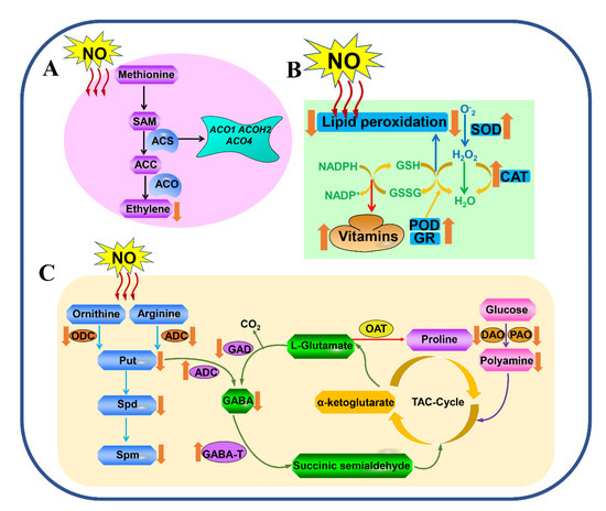 The regulatory mechanisms involving NO that are related to the postharvest senescence of plants: (A) ethylene biosynthesis, (B) the antioxidant system, (C) polyamine metabolism and γ-aminobutyric acid (GABA) shunting. SAM, S-adenosyl-methionine; ACS, 1-aminocyclopropane-1-carboxylate synthase; ACO, ACC oxidase; NO, nitric oxide; SOD, superoxide dismutase; CAT, catalase; POD, peroxidase; GR, Glutathione reductase; NADPH, NADPH oxidase; GSH, glutathione; GSSG, Oxidized glutathione; O−2, Superoxide radicals; H2O2, hydrogen peroxide; Put, putrescine; Spd, spermidine; Spm, spermine; ADC, arginine decarboxylase; DAO, diamine oxidase; PAO, polyamine oxidase; GABA, γ-aminobutyric acid.