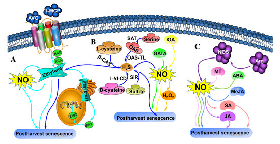 Schematic model of the interaction among H2, H2S, H2O2 and other plant hormones in postharvest senescence. (A) NO interacts with ethylene, (B) NO interacts with H2S, H2O2, GATA or OA, (C) NO interacts with plant hormones. AVG, aminoethoxyvinylglycine; 1-MCP, 1-methylcyclopropene; Arg, arginine; OA, oxalic acid; NOS, nitric oxide synthase; ABA, abscisic acid; NO, Nitric oxide; H2S, hydrogen sulfide; H2O2, hydrogen peroxide; MT, Melatonin; MeJA, Methyl jasmonate; GABA, γ-aminobutyric acid; l-/d-CD, 1-/d-cysteine desulfhydrase; OAS-TL, O-acetylserine (thiol)lyase; SiR, sulfite reductase; β-CAS, β-cyanoalanine synthase; JA, jasmonic acid; SA, salicylic acid.