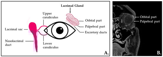 (A) The lacrimal apparatus anatomy—illustration. (B) Coronal contrast-enhanced T1-weighted MR image with fat saturation depicting the normal aspect of the lacrimal gland localized in the superolateral region of the orbit (extraconal) and its lobe divisions.