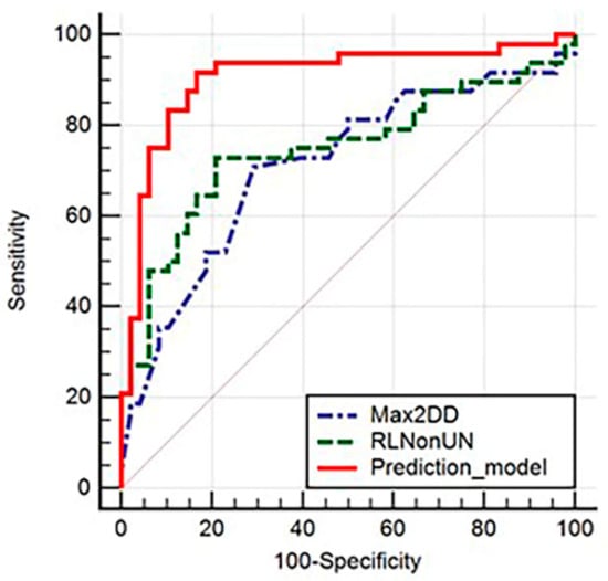 Area under the receiver-operating curve analysis of the two predictive radiomic features (Max2DDC and RLNonUN) and the prediction model for pSS parenchymal changes in LG.