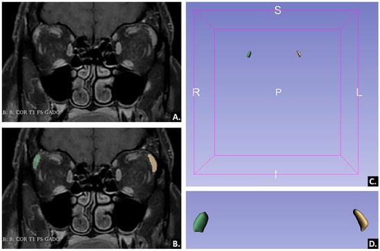 Example of lacrimal gland segmentation in a patient diagnosed with primary Sjögren’s Syndrome. Coronal contrast-enhanced T1-weighed image with fat saturation, before segmentation (A) and after segmentation (B); 3D reconstruction of the lacrimal glands (C); magnified 3D reconstruction of the lacrimal glands (D).