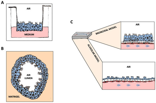 To fill this gap, 3D cultures that recapitulate human lung structure and physiology have been developed. In 2005, Fulcher et al. [20] reported that primary airway epithelial cells (HAE) can be grown on transwells under an air–liquid interface (ALI) and differentiated into a pseudostratified epithelium composed of the main airway cell types, i.e., basal, goblet, club and ciliated cells. Airway cells can be isolated from patients and used for studies of epithelial–stroma interaction when organized as organoids. These are self-organized 3D multicellular structures where the pseudostratified airway epithelium interacts with the extracellular matrix and maintains its main functions, i.e., mucus production and ciliary beating. Thus, these structures can reproduce in vitro the features of the human airway epithelium in vivo [21,22]. The respiratory epithelium organoid culture has been successfully used for research on cystic fibrosis (CF) and other pulmonary diseases [23,24], including viral infections [25,26,27]. However, a main limitation of the organoid models is the absence of vascularization and, therefore, the impossibility to study interactions between the viruses and cells of the immune system [28].