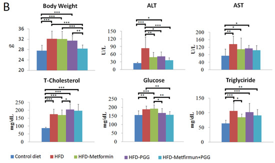 2.2. Combination of PGG and Metformin Nearly Completely Reversed Biochemical and Histopathological Alterations of NAFLD in HFD-Fed Mice