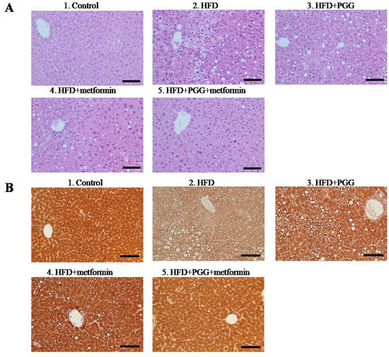 In parallel to the reversal effects on body weight and serum aminotransferases, PGG and metformin treatments also considerably reversed the histopathological alterations of NAFLD in the liver tissues of HFD-fed mice (Figure 2A). While HFD-fed mice treated with PGG alone (Figure 2(A3), HFD+PGG) or metformin alone (Figure 2(A4), HFD+metformin) exhibited partial reversal, combination of PGG and metformin (Figure 2(A5), HFD+PGG+metformin) near completely reversed all pathological features of NAFLD. As graded by the extent of hepatic steatosis, the estimated 75% steatosis in the HFD-fed mice was considerably reduced to 50%, 35% and 5% (a 96% reduction from control) by treatment with PGG alone, metformin alone and combination of PGG and metformin, respectively. As shown in Supplementary Table S2, the combination group (HFD+PGG+metformin) had the lowest steatosis score when the control group was considered as 0. These findings indicate that a combination of PGG and metformin can effectively reverse the biochemical and histopathological alterations of NAFLD in HFD-induced NAFLD mice.