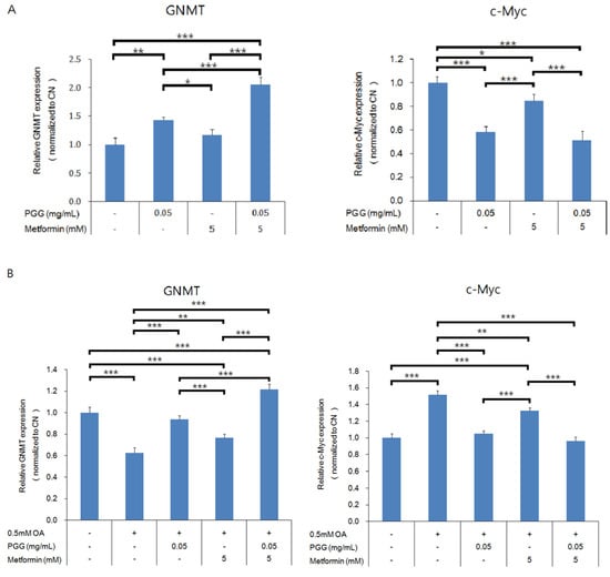 Quantitative reverse-transcription PCR was performed to investigate the expressions of GNMT and c-Myc in both in vitro cultured human hepatoma Mahlavu cells and in vivo hepatocytes from C57BL/6J mice. As shown in Figure 3A, PGG alone, and combination of PGG and metformin all induced significant expressions of gene and protein in GNMT and suppressed those in c-Myc (Figure 3A and Supplementary Figure S1). For the group of metformin alone, the induction of GNMT was not significant, but the c-Myc was downregulated (p < 0.01). To mimic the NAFLD condition in vivo, Mahlavu cells were treated with oleic acid, a monounsaturated fatty acid known to induce steatosis in cultured mammalian cells [26]. As shown in Figure 3B, oleic acid treatment caused a decrease in mRNA expression of GNMT (p < 0.001) and an increase in mRNA expression of c-Myc (p < 0.001). In Mahlavu cells treated with oleic acid, similarly, PGG alone, metformin alone and combination of PGG and metformin induced significant increase in GNMT gene expression and significant decrease in c-Myc expression, with PGG and metformin combination being the strongest inducer (Figure 3B). A similar experiment was conducted in hepatocytes from C57BL/6J mice fed with regular diet or HFD. Again, all three treatments induced significant increases in GNMT gene expression, with the PGG and metformin combination being the strongest inducer (Figure 4).