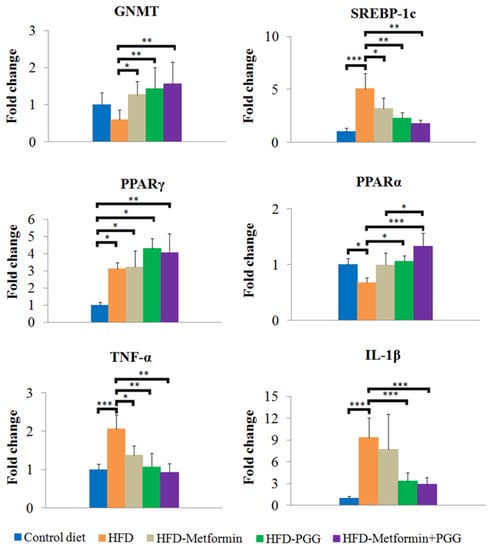The results obtained from pathologic examination implied that PGG and metformin regulate lipid homeostasis in the liver. Therefore, specific genes related to lipid regulation were further elucidated by quantitative RT-PCR. SREBP-1c is a pro-lipogenic transcription factor that regulates the expression of genes involved in lipid synthesis. Another transcription factor is peroxisome proliferator-activated receptor gamma (PPARγ) [27,28]. HFD significantly stimulated expression of SREBP-1c and PPARγ. PGG or metformin downregulated expression of SREBP-1c but significant reduction was only observed in the group of combination treatment. Inhibitory effects of HFD-induced PPARγ expression were not observed in all the treatment groups. PPARα is responsible for β-oxidation of fatty acid in the liver [29]. Downregulated β-oxidation in NAFLD subjects leads to fatty acid accumulation in the liver, which ultimately induces ROS production and stimulates pro-inflammatory effects [30]. In this study, PPARα was decreased upon HFD administration, which was reversed significantly by PGG and combination treatment. Combination treatment inhibited the expression of HFD-stimulated specific pro-inflammatory cytokines including TNFα and IL-1β (Figure 4). These results suggested that combination of PGG and metformin inhibited hepatic lipid accumulation by reducing lipogenesis via SREBP-1c suppression, improving β-oxidation and inhibiting inflammation, and that these effects might be associated with the presence of GNMT.