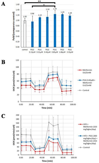 The rescue effect of PGG in metformin-induced oxygen consumption rate (OCR) decrease was evaluated by Seahorse analysis using in vitro and in vivo models. (A) The OCR maximum capacity in Mahlavu cells treated with different doses of PGG. (B) Mitochondrial respiration reflected by OCR levels was detected in Mahlavu cells treated with metformin alone and treated with metformin combined with PGG, respectively. (C) Mitochondrial respiration reflected by OCR levels was detected in mouse primary hepatocytes obtained from HFD-induced NAFLD mice treated with metformin alone and treated with metformin combined with PGG, respectively. (* p < 0.05; ** p < 0.01; N = 2/Control group; N = 3/Metformin group and Metformin + PGG group).