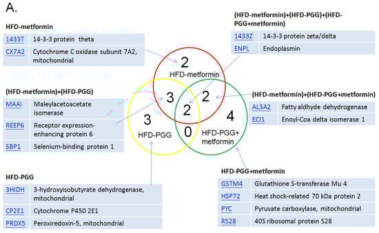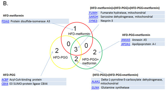 Proteomic analysis was performed for liver samples from HFD-induced NAFLD mice treated with either PGG alone, metformin alone or combination of PGG and metformin. The MASCOT analysis identified upregulation of 16 proteins, and downregulation of 10 proteins among all three treatment groups. As shown in Figure 5A, while upregulated expressions of 14-3-3 protein zeta (1433Z) and Endoplasmin (ENPL) were identified in all three treatment groups, upregulated expressions of Glutathione S-transferase mu 4 (GSTM4), Heat shock protein 72 (HSP72), Pyruvate carboxylase (PC), and 40S Ribosomal protein S28 (RS28) were only identified in the combination of PGG and metformin treatment group. On the other hand, the expressions of Fumarate hydratase (mitochondrial), Sarcosine dehydrogenase (mitochondrial) and Nesprin-3 were downregulated in all three treatment groups, and the expression of Annexin A5 and Apolipoprotein A1 was only downregulated in the combination of PGG and metformin treatment group. In the metformin alone treatment group, while 14-3-3 protein theta and cytochrome c oxidase subunit 7A2 were upregulated, protein disulfide-isomerase A3 was downregulated. In the PGG alone treatment gruop, upregulations of 3-hydroxyisobutyrate dehydrogenase (mitochondrial), cytochrome P450 and peroxiredoxin-5 (mitochondrial), as well as downregulations of acyl-CoA-binding protein and E3 SUMO-protein ligase CBX4 were identified (Figure 6).