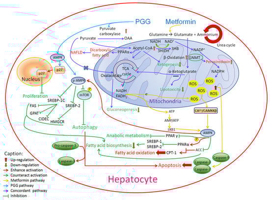 PGG treatment has been shown to increase the expression of phosphorylation of AMPK (AMP-activated protein kinase) in various cells [54,55]. Although both PGG and metformin induce AMPK, their mechanisms are different [56,57]. As shown in Figure 7, PGG activates AMPK and then activates p27. On the other hand, metformin is more complicated. Metformin enters mitochondria and is involved in TCA cycle causing the increase of ROS and ATP. Caspase-9 is then activated to induce apoptosis while AMPK inhibits fatty acid synthesis.