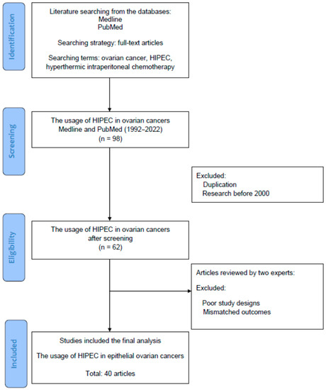 Figure 1 is a flowchart of the searching, screening, and including process of the references we selected from the literature. In this review, all of the reference articles were retrieved from the databases Medline and PubMed using the searching terms “ovarian cancer”, “hyperthermic intraperitoneal chemotherapy”, or “HIPEC” for the research topic. In this (identification) stage, only full-text articles were considered for a further analysis. Up to 31 March 2022, we searched potential articles in the literature from the databases Medline and PubMed. The literature published from 1 January 1992 to 31 March 2022 was searched to identify eligible articles for the review. In the second (screening) stage, duplicated articles and articles published prior to 2000 were excluded to ensure the novelty of this review. In the next stage, two experts in the field independently inspected the contents of articles including demographics, research designs and outcomes and identified potentially eligible studies for exclusion and inclusion. The retrieved articles with poor research designs or mismatched outcomes were excluded at this stage. The discrepancies between the two experts were discussed by their mutual communication to reach a consensus. All eligible articles using the searching terms and strategies (database searching, screening, selection and inclusion of eligible articles) were included in the review. From a total of 98 articles identified in the searching process, 40 articles were ultimately collected for review.