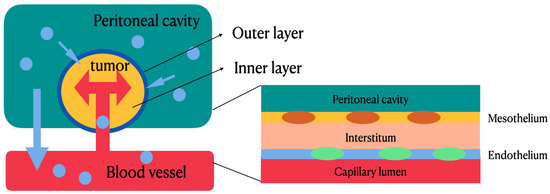 Figure 2 shows the pharmacokinetic model of HIPEC which is delivered based on (Cp/Cb)IP/(Cp/Cb)IV, where Cp represents the concentration of the drug in the peritoneum and Cb represents the concentration of the drug in blood. In terms of chemotherapeutic agents used during HIPEC, area under the curve (AUC) represents drug concentration and exposure time to the tumor in the peritoneum [8,9]. The mechanisms of HIPEC involve a two-compartment model to describe the pharmacokinetics of IPDD [5,8,9,10]; intraperitoneal chemotherapy drugs are delivered via convection and diffusion gradients. Figure 2 illustrates the bidirectional models for intravenous (IV) and intraperitoneal (IP) therapy. The outer layer of the tumor can achieve a high concentration of drug levels by direct exposure (IP), while the drug can reach the inner core layer of the tumor by microcirculation through systemic circulation (IV). Between the two compartments is the peritoneal–plasma barrier (PPB), which plays a key role in the compartmental model and can decrease the drug clearance rate from the peritoneal cavity to systemic circulation. During IP therapy, the PPB blocks the leakage of chemotherapeutic agents from the peritoneal cavity and tumor tissues to local vessels, thus maintaining a higher concentration of chemotherapeutic agents within the tumor tissues to facilitate tumor apoptosis, and a lower concentration of chemotherapeutic agents within the local vessels to decrease systemic toxicity.