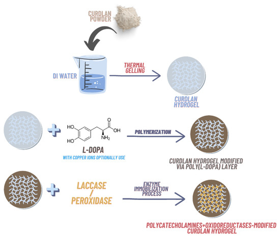 For many reasons, related to bioremediation of various pollutants or medical applications, oxidoreductases have been immobilized on different hydrogels which provide appropriate and biocompatible environments for enzymatic reactions. For example, immobilized laccases from T. versicolor and C. unicolor were effectively applied for removal of persistent trace compounds in wastewaters (diclofenac, triclosan, paracetamol, bisphenol A, oils, dyes and other pollutants) [14,15,16,17,18,19]. Sampaio et al. [20] proposed the bacterial nanocellulose-based hydrogel with immobilized commercial laccase. This hydrogel exhibited antibacterial properties and cytotoxicity acceptable for wound dressings. Therefore, there is a reason to verify the potential of other oxidoreductases modified hydrogels for medical applications. One of the promising hydrogel matrices which can be considered for this application is curdlan (β-(1,3)-glucan) which forms low-set and high-set gels under thermal treatment. Recently, the following new possibilities of curdlan application in medicine emerged: (i) as solubilized and biologically active derivatives and (ii) as compounds of insoluble hydrogels designed for wound dressings, as an example [21,22,23,24,25]. As a biomaterial, curdlan shows not only benefits but also disadvantages. For example, in particulate form it may induce granuloma formation, microembolization and inflammation [26], although, according to some reports, high-set curdlan did not stimulate monocyte and macrophage response [27]. Another disadvantage of curdlan hydrogel is insusceptibility to immobilization of different molecules (including enzymes) due to its chemical structure and lack of highly reactive groups in glucose units. For this reason, curdlan requires pre-activation with active linkers before the molecules bind. A promising tool which can be used for this purpose is dopamine which was reported to form self-adhesive polydopamine (PDA) coatings on different organic and inorganic surfaces [28]. PDA coatings were used, for example, for the modification of graphene nanosheets [29,30], Fe3O4 nanoparticles [30,31,32], silica nanoparticles [33] or polymers [34,35,36]. Importantly, PDA coatings contain catechol domains which can react with thiols and amines via Michael addition or Schiff base reactions [37,38], thus allowing for secondary coupling reactions with different organic molecules. Polymerized L-DOPA (PLD) and norepinephrine (PNE) were recently proved to act similarly to PDA, namely, they can adhere to solid matrices (polysaccharide hydrogel, polyester fibers, cellulose membranes) [39,40,41]. Both dopamine and L-DOPA polymerize in the presence of oxidants (as O2 or Cu2+ ions) and in slightly alkaline buffers. In our recent works, we deposited the PDA and PLD coatings on high-set curdlan hydrogel [36,39]. Both types of the hydrogel revealed an increased soaking capacity and stability in human blood and serum, accelerated blood clot formation, reduced the tendency of fibroblast adhesion and revealed nontoxicity in the Danio rerio model. Both PDA- and PLD-coated curdlan hydrogels were coupled with gentamicin, resulting in modified curdlan hydrogels of high antibacterial activity [36,39]. The obtained results suggest that PDA- and PLD-coated curdlan hydrogels show high potential in the treatment of infected wounds and other biomedical applications.