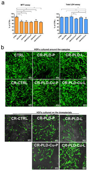 Cytotoxicity tests against human dermal fibroblasts (HDFs): (a) quantitative evaluation of cytotoxicity by MTT test (cell metabolism) and total LDH assay (cell number); CTRL−-negative control of cytotoxicity revealed 100% viability; * statistically significant (p < 0.05) results between indicated group according to One-way ANOVA with post-hoc Tukey test; (b) qualitative evaluation of cytotoxicity by live/dead staining (green fluorescence-viable cells, red fluorescence-dead cells) followed by CLSM observation; CTRL-control cells grew on polystyrene well.