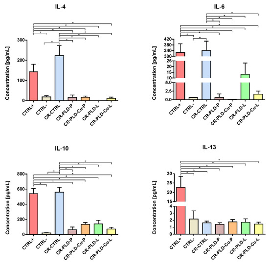 Based on all tests, 4 samples were selected for further cell culture characterization: CR-PLD-L, CR-PLD-P, CR-PLD-Cu-L, and CR-PLD-Cu-P. The samples were put into the wells of 24-multiwell plate and preincubated in the complete culture medium. Human THP-1 monocytes were seeded directly on the biomaterials at the density of 2.5 × 105 cells/sample. Monocytes grown in a polystyrene well of the 24-multiwell plate without biomaterial served as negative control (CTRL−), showing a physiological level of cytokine release. Monocytes cultured in a polystyrene well of the 24-multiwell plate in the medium supplemented with 100 ng/mL of lipopolysaccharide (LPS) and 25 ng/mL of interferon-gamma (INF-γ, Sigma-Aldrich Chemicals) served as positive control (CTRL+), showing increased level of cytokine release due to stimulation with pro-inflammatory factors. After 48-h culture, cell culture supernatants were harvested to assess concentrations of interleukin (IL)-4, IL-6, Il-10, and IL-13 by human specific ELISA kits (EIAab). ELISAs were carried out according to the manufacturer’s protocol using three independent samples. Statistically significant differences between the samples were considered at p < 0.05 according to#]p098 One-way ANOVA with post-hoc Tukey test (GraphPad Prism 8.0.0 Software, San Diego, CA, USA).
