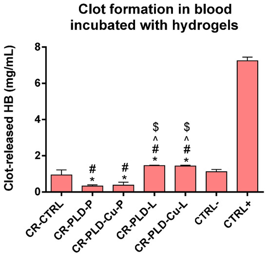 Interactions with blood are an important aspect of wound dressing–human blood interactions, especially for bleeding wounds. For this reason, the clot forming ability of the blood was verified during 30 min of contact with the samples. In comparison with CTRL− (negative control), CR-CTRL reference hydrogel resulted in similar clot-forming capacity (Figure 4). The pro-clotting effect was distinct for both peroxidase-bound coatings, with significant difference in comparison with negative control and uncoated curdlan hydrogel. On the other hand, a slight but significantly different anti-clotting effect was observed for both laccase-bound coatings, in comparison with negative control and uncoated curdlan hydrogel (Figure 4). This suggested that modification of curdlan hydrogel with PLD + laccase complex was almost neutral for blood clotting capacity, while PLD + peroxidase coating enhanced the clot-forming ability. Use of copper ions for PLD-mediated oxidoreductase immobilization did not affect the clotting ability of blood incubated with the studied hydrogels.