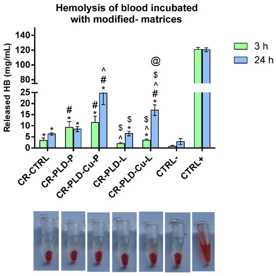 Hemolysis in blood incubated with control and poly(L-DOPA)-modified curdlan hydrogel samples with immobilized oxidoreductases. (*) symbol indicates statistically significant differences between the negative control and other samples, (#) symbol indicates statistically significant results between CR-CTRL sample and other samples, (^) symbol indicates statistically significant results between CR-PLD-P sample and other samples, ($) symbol indicates statistically significant results between CR-PLD-Cu-P sample and other samples, (@) symbol indicates statistically significant results between CR-PLD-L sample and other samples. *, #, ^, $, @ symbols indicate statistically significant results according to One-way ANOVA with post-hoc Tukey’s test for 3 h and 24 h (p < 0.05), respectively in comparison with appropriate sample variants for each time point.