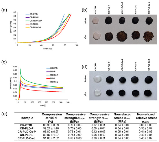 Resistance of wound dressing to mechanical pressure is important in view of its practical use. Representative stress–strain curves, as well as the compression–relaxation curves are presented in Figure 6a,c. The stress–strain curves obtained for all PLD + oxidoreductases-modified curdlan hydrogels, as well as for pristine curdlan hydrogel, were subjected to compression with a force of 100N, and showed a nonlinear increase in compressive stress in relation to strain (Figure 6a). Compressive strength was also similar for all samples (Figure 6e). The curves showed similarity to elastomers’ behavior and indicated the viscoelastic behavior of the tested hydrogels. However, control hydrogel resisted the pressure of 100N without a notable structural change while all PLD + oxidoreductases-modified hydrogels were significantly damaged (Figure 6b). Moreover, samples containing higher amounts and activities of enzymes (CR-PLD-Cu-L and CR-PLD-Cu-P) were more disrupted than samples containing less enzymes (CR-PLD-L and CR-PLD-P; Figure 6b). This visual observation was in agreement with values of hydrogels compression at 100N: approximately 86% for pristine curdlan and approximately 89–96% for modified curdlan (Figure 6e). It seems that PLD + oxidoreductases modification of curdlan reduced its elasticity, with simultaneous increase of plasticity. The shape of the curves suggested the lack of distinct damages in the structure of the samples which may be related to the homogenous impairment of the stability of curdlan helices (Figure 6a).