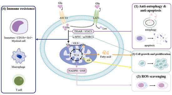 - Gln metabolism is able to protect endocrine-related cancer cells against apoptosis and autophagy through the TIGAR and STAT3 signaling pathways [,].