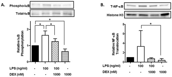 2.3. Effect of DEX on LPS-Induced IκB Activation and Translocation of NF-κB