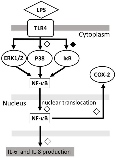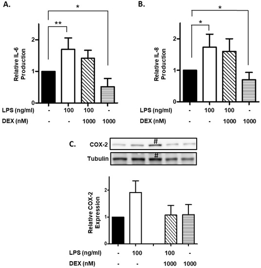 2.4. Effect of DEX on LPS-Induced IL-6 and IL-8 Production and COX-2 Expression