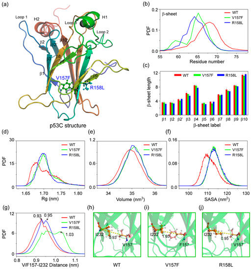 Structural analyses of p53C in WT, V157F and R158L systems. (a) The structure of p53C. The location of V157F and R158L mutations are marked. (b) The distribution of residue number for β-sheet structure over the MD runs for three systems. (c) The average β-sheet length (residue number) for eleven β-strands. The probability density function (PDF) of (d) the radius of gyration (Rg), (e) the volume, (f) the solvent-accessible surface area (SASA) of whole p53C, and (g) the distance between Cα atoms of V/F157 and I232. The snapshots of (h) WT, (i) V157F and (j) R158L systems at 1000 ns show the distance between Cα atoms of V/F157 and I232.