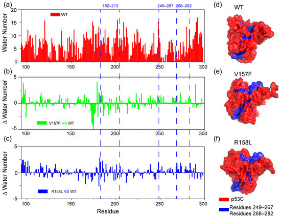 The extent of solvation of p53 C in WT, V157F and R158L systems. (a) The number of water molecules within 0.35 nm of WT p53C. The three aggregation core fragments (residues 182–213, 249–267 and 268–282) are pointed out by blue dotted line. (b,c) The difference value of water number between V157F/R158L mutant and WT p53C. (d–f) Snapshots of exposure for residues 249–267 and 268–282 in WT, V157F and R158L systems. Residues 249–267 and 268–282 are colored blue.