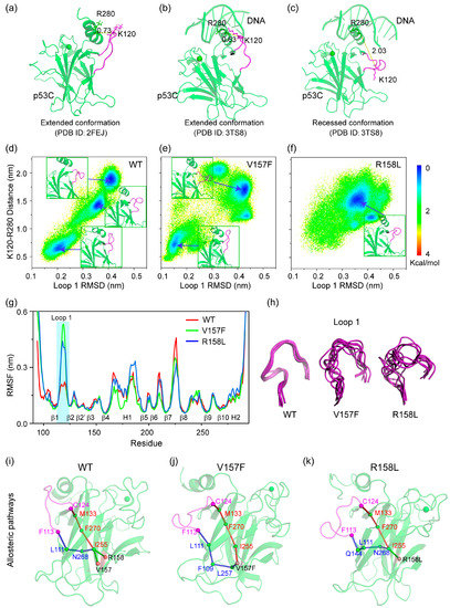 Effect of V157F and R158L mutations on the conformation and flexibility of loop 1. (a) The structure of WT p53C without DNA (PDB ID: 2FEJ). Loop 1 is colored magenta. The extended (b) and recessed (c) conformation of loop1 with DNA (PDB ID: 3TS8). Free energy surfaces (in kcal mol−1) of WT p53C (d), V157F (e) and R158L (f), respectively, as functions of loop 1 RMSD and the distance between Cα atoms of K120 and R280. (g) Average Cα-RMSF of p53C. (h) Snapshots show the different flexibilities of Loop 1. Nine representative snapshots at the simulation time = 600, 650, 700, 750, 800, 850, 950 and 1000 ns were superposed with each other. (i–k) Snapshots of optimal and suboptimal allosteric paths from residue V157 or R158 to loop 1, showing sphere and stick representations.