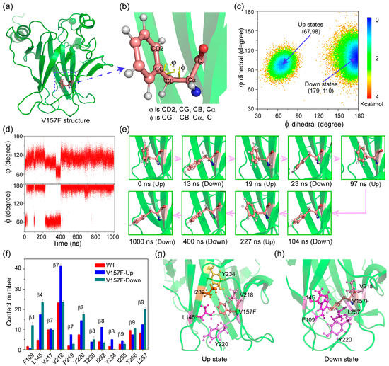 The orientation of aromatic ring of residue F157. (a) The structure of V157F mutant. (b) The local magnified snapshot of the aromatic ring of residue F157. Its orientation is described by two dihedral angles (φ, ϕ). (c) Potential mean force (PMF) as functions of dihedral angles φ and ϕ, emerging “up” and “down” conformational states in V157F system. (d) The function of two dihedral angles (φ, ϕ) with simulation time. (e) Snapshots of conformational states of the aromatic ring along simulation time. (f) The contact number between V157F and nearby amino acids. Snapshots of the interaction network in ‘up’ (g) and ‘down’ (h) conformational states.