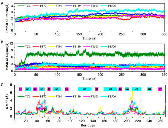 The root-mean-square deviations (RMSDs) value can be used to examine the deviation between the target coordinate set and the reference coordinate set during the simulation process, which reflects the positional change of the molecular structure over time. The fluctuations of RMSD can also characterize the stability and convergence of the system. Here, the RMSD values of protein and ligand over time were monitored during the simulation. It can be seen from Figure 1A that after 150 ns, the protein RMSD fluctuations in each system were all within 1.0 Å, indicating that the system tended to be stable. As shown in Figure 1B, all ligands were also relatively stable after 50 ns (fluctuated within 1.0 Å). The RMSD of TCL changed greatly at about 30 ns (from 1.0 Å to 8.0 Å), which indicated that the binding position of TCL may have changed. In addition, the root-mean-square fluctuations (RMSFs) of proteins were also monitored. From Figure 1C, we can see that among the six systems, the H6 and H7 were more flexible than the other domains. The α-helix of H6 and H7 are located around the binding pocket, which directly affects the stability of inhibitor binding. The flexibility of H6 and H7 was the smallest in PT70 system, which may be the reason for the best binding affinity of PT70.