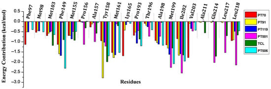 To predict the binding affinity between these inhibitors and InhA, the equilibrated trajectories were used to calculate the binding free energies by the MM–GBSA method. As shown in Table 1, the binding free energies of PT70, PT91, PT119, PT501, TCL and PT506 to InhA were −32.84 kcal/mol, −32.23 kcal/mol, −32.27 kcal/mol, −32.09 kcal/mol, −28.34 kcal/mol and −28.11 kcal/mol, respectively. By comparing the contributions of various energy terms, it can be seen that the van der Waals interaction energies were much higher than the electrostatic interaction energies, indicating that the van der Waals interaction was the main driving force for the binding of inhibitors. In addition, the order of the enthalpy changes was basically consistent with the order of the Ki values measured experimentally.