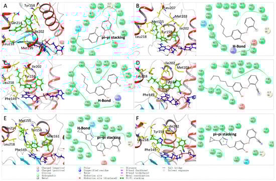To further identify hotspot residues for the binding of these inhibitors to InhA, residue energy decomposition was carried out. As shown in Figure 2, the residues with large energy contributions mainly included Phe149, Tyr158, Met161, Met199, Ile202 and Leu218. To analyze the relationship between the residue energy contribution and the binding mode, principal component analysis was performed, and the free energy landscapes were plotted based on the top two principal components (Figure S1). It can be seen that the conformational distribution of each system was relatively concentrated, tending to form a single conformational state. The structures located at the lowest energy well were selected as the representative conformations of each system and the detailed binding modes between them and InhA were shown in Figure 3. It can be seen that the residue Tyr158 can not only form pi–pi stacking with the benzene rings on TCL and PT501 molecules, but also form hydrogen bonds with the hydroxyl groups on PT70 and PT91 molecules. Therefore, the interaction between the residue Tyr158 and the inhibitor is very important for the binding of inhibitors. Moreover, the benzene rings and hydrophobic tails of TCL, PT70, PT91 and PT119 can also form van der Waals interactions with residues Phe149, Phe97, Met103, Met155, Tyr158, Met161, Met199 and Ile202. In the PT501 system, the N atom of the triazole ring can act as a hydrogen bond acceptor to form a hydrogen bond with Gln214. The triazole and cyclopropane substituent of PT501 protruded into the hydrophobic pocket formed by Met155, Leu217, Ile202, Ala157 and Pro156 (Figure 3E). The above residues were also critical to the binding of PT501 and InhA (Figure 2). The triazole ring of PT506 can form pi–pi stacking interaction with Phe149. In addition, the triazole ring and cyclopropane substituents also extended into the hydrophobic pocket formed by Met199, Val203, Leu218, Met155, Trp222, Ile202 and Pro193.