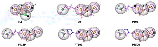 Alignment between the multiple ligand-based AHRR pharmacophore model and each inhibitor. The ligands are shown as purple sticks. Orange ring: aromatic ring (R), pink ball: hydrogen bond acceptor (A), green ball: hydrophobic group (H).