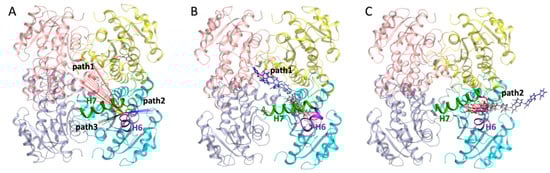 To explore the dissociation kinetics of InhA inhibitors, each inhibitor was dissociated using the tau random acceleration molecular dynamics simulation (τRAMD) method. For the six inhibitors studied in this work, we found a total of three possible dissociation pathways (as shown in Figure 5A). Among them, in the path1 channel, the inhibitors dissociated along the H7 side, and in the path2 channel, they dissociated along the H6 side, while in the path3 channel, the inhibitors dissociated from the gap formed by H6 and H7. Furthermore, the dissociation orientations of the 120 trajectories for each inhibitor were classified and counted (as shown in Table S1). The results showed that the two most dominant dissociation pathways adopted by the six inhibitors were path1 and path2, while path3 was rarely present. It can be seen from Table S1 that the number of dissociated trajectories of TCL according to path1, path2 and path3 were 50, 69 and 1, respectively. It can be speculated that TCL is relatively small and can dissociate from both path1 and path2 channels (Figure 5B,C). For the PT70, PT91 and PT501, their main dissociation pathways were mainly according to the path1 channel, while PT119 and PT506 were mainly along the path2 channel (Table S1 and Figure S3).