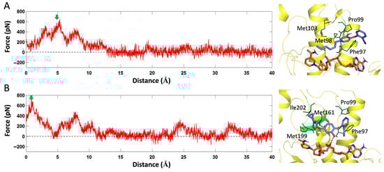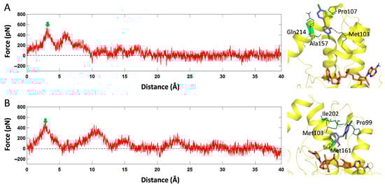 The force profiles of PT119 (A) and PT506 (B) over the reaction coordinate along path2 channel. The structures at the maximum force (green arrow) were extracted and displayed on the right side of the picture.