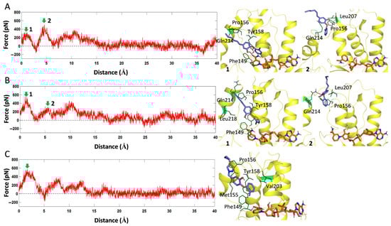 The force profiles of PT70 (A), PT91 (B) and PT501 (C) over the reaction coordinate along path1 channel. The structures at the maximum force (green arrow) were extracted and displayed on the right side of the picture. The number “1” corresponds to the first intermediate state in the dissociation process, and the number “2” corresponds to the second intermediate state.