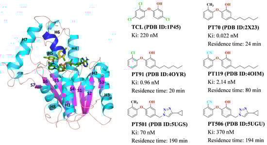 The binding mode of InhA with TCL (left); the chemical structures of the studied six inhibitors as well as their crystal structures with InhA: TCL (1P45 []), PT70 (2X23 []), PT91 (4OYR []), PT119 (4OIM []), PT501 and PT506 (5UGS, 5YGU []) (right). The β-sheet (S1–S7) was colored with magenta cartoon, the α-helix (H1–H8) was colored with cyan cartoon and the loop region was colored with pink.