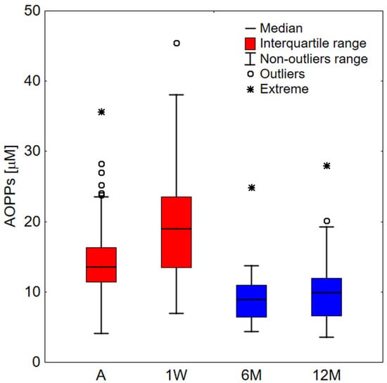 AOPPs values for a study group. A—COVID-19 patients on admission to hospital (n = 66); 1W—COVID-19 patients one week upon admission (n = 44); 6M—COVID-19 patients after 6 months from infection (n = 30); 12M—COVID-19 patients after 12 months from infection (n = 27). Data far away by more than 1.5 and 3 interquartile range from this range were considered outliers and extreme, respectively.